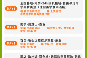 2.住宿:南宁四钻酒店,百色四钻酒店,乐业酒店,靖西三星酒店,单人报名组织方优先安排同性拼,如遇到无同性法拼房4天需要补房差300元,5天需补房差400元,五一/国庆4天房差500元,5天房差600元)
