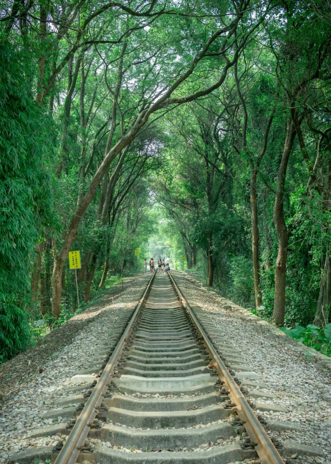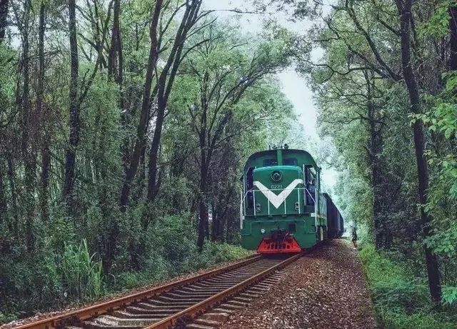 在笔直的铁路上空编织成仿佛能穿越时空的隧道