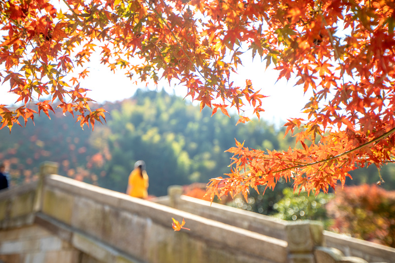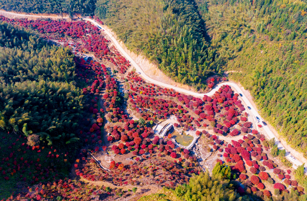 12:30开始闲逛枫叶林,【十里枫叶林】,抬眼望去,层层叠叠的枫叶红得浓烈,红得似火,染红了山谷,染红了山涧,就像一条鲜红的地毯铺在蜿蜒曲折的山谷中,美轮美奂,美不胜收。有小桥,有竹林,有牌坊,有泥房,在枫叶的衬托下格外出片,从高空俯瞰,火红的枫叶与竹林山色构成了一幅秋日“枫”景画卷。