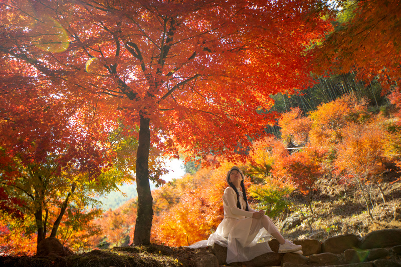 漫山的枫叶里,深红、粉红、橙红、橘红,层次分明