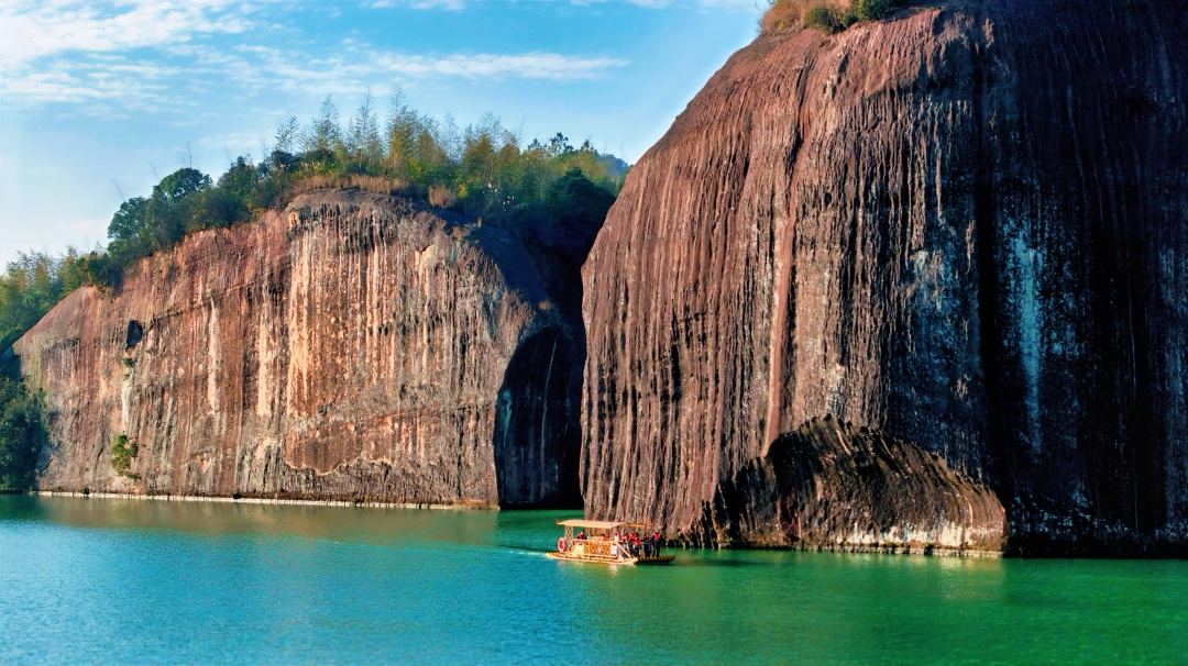 九龙水寨环抱在碧波荡漾的翠江怀里,天生丽质,美得不可方物,两岸丹霞、峭壁森然而立,直指云霄,厚重而伟岸。这就使得九龙水寨刚柔并济,既有二八佳人的温婉曼妙,又有关东大汉的豪迈沉雄。