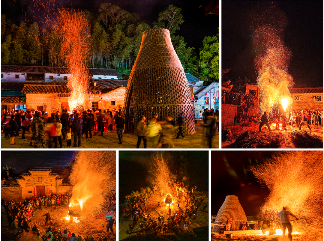 月下烧瓦塔祈福:一场热烈的火焰仪式。点燃瓦塔,共祈好运,感受红火炽热的客家情怀。
