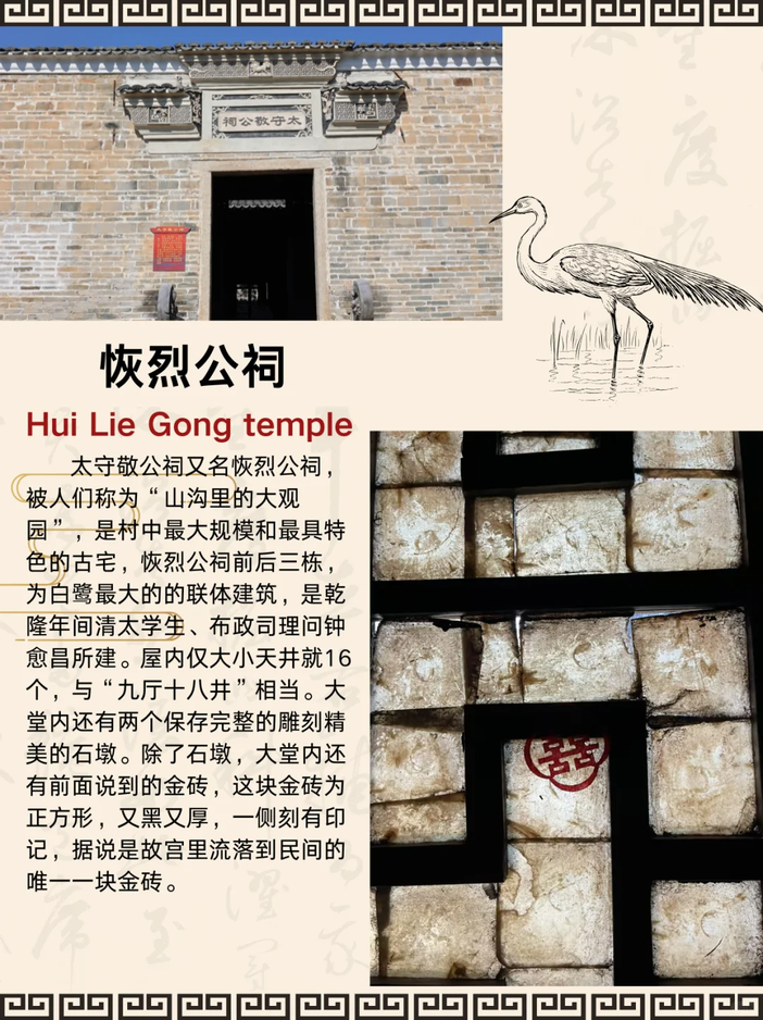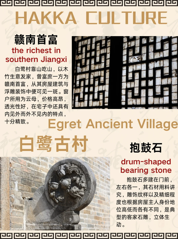 后前往【白鹭古村】,素有“研究明清古建筑活博物馆”之称,是江南保存最完好最集中的客家古村落之一。古村沿着鹭溪河呈月牙形、南北向分布,建筑多为明清时期的“四水归堂”风格,如兴复堂、恢烈公祠、王太夫人祠等,造型精巧,布局通透。 南宋绍兴六年(1136年),唐中书令钟绍京十六世孙钟舆携族人迁居至此,因梦见白鹭栖于溪畔而得名,至今已有八百多年历史。孕育了东河戏,是赣南采茶调与昆曲融合的产物。此外,这里还承载着丰富的红色历史,1931年毛泽东、朱德等曾率红一方面军在白鹭一带隐蔽休整,在钟氏宏略堂宗祠居住,并召开“白鹭会议”,研究部署第三次反“围剿”。