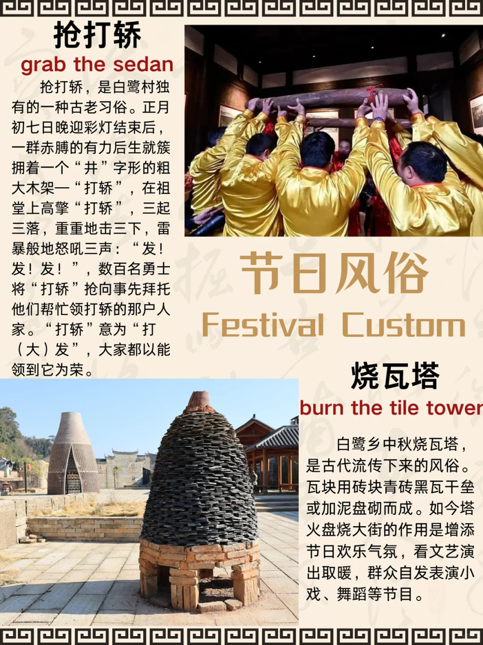 第三节:白鹭晚宴 开餐(有主持人介绍白鹭村席、烧瓦塔、菜品等),四盘八碗(六荤六 素含一盘红鸡蛋)。