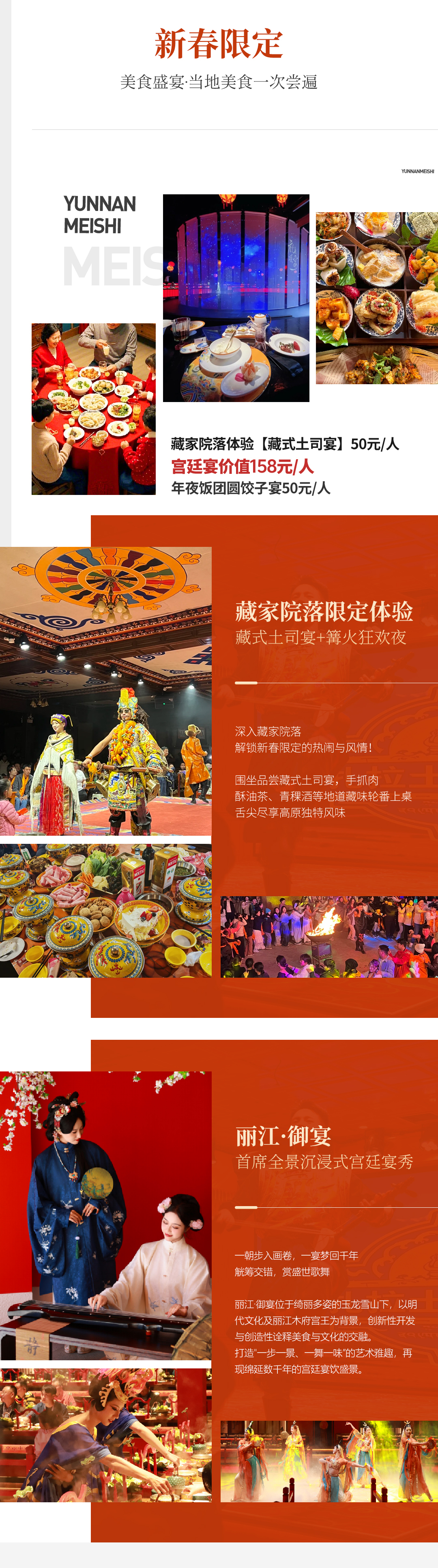 ▷ 游览结束后乘车前往丽江,【享用丽江宫廷宴】,菜品精致,融合滇味与宫廷特色,用餐环境典雅,体验舌尖上的奢华。