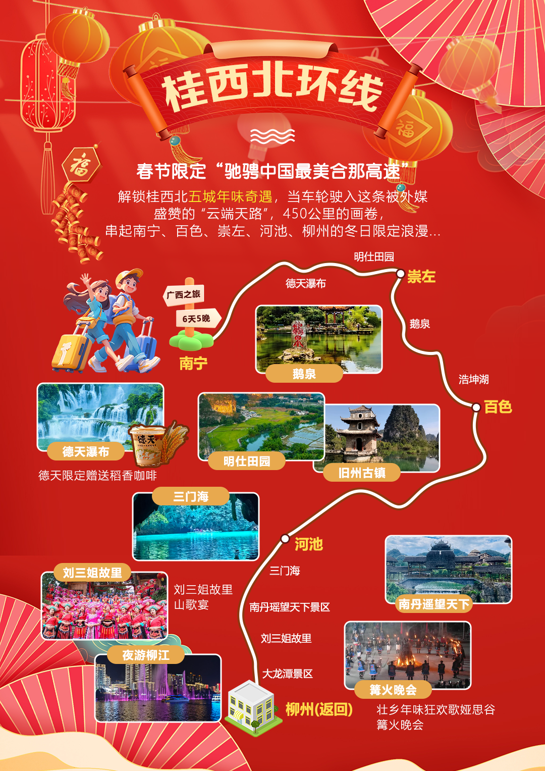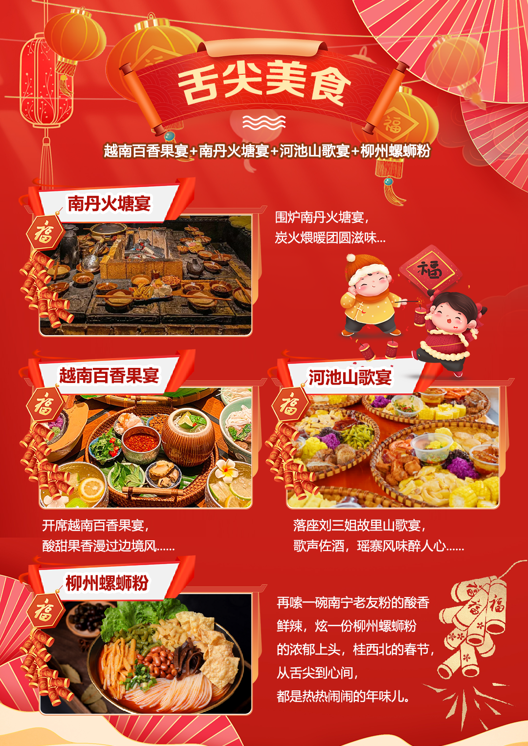 用餐:5早 5 正+1螺蛳粉,正餐餐标 40 元/人,(刘三姐山歌宴+南丹火塘宴+百香果宴+农家餐+柳州螺蛳粉