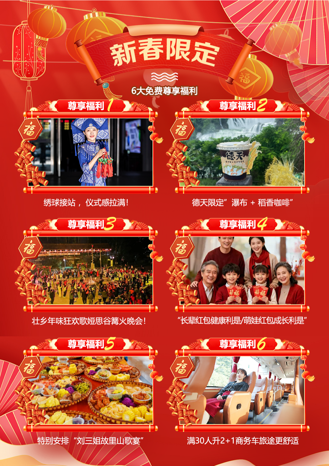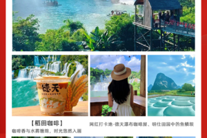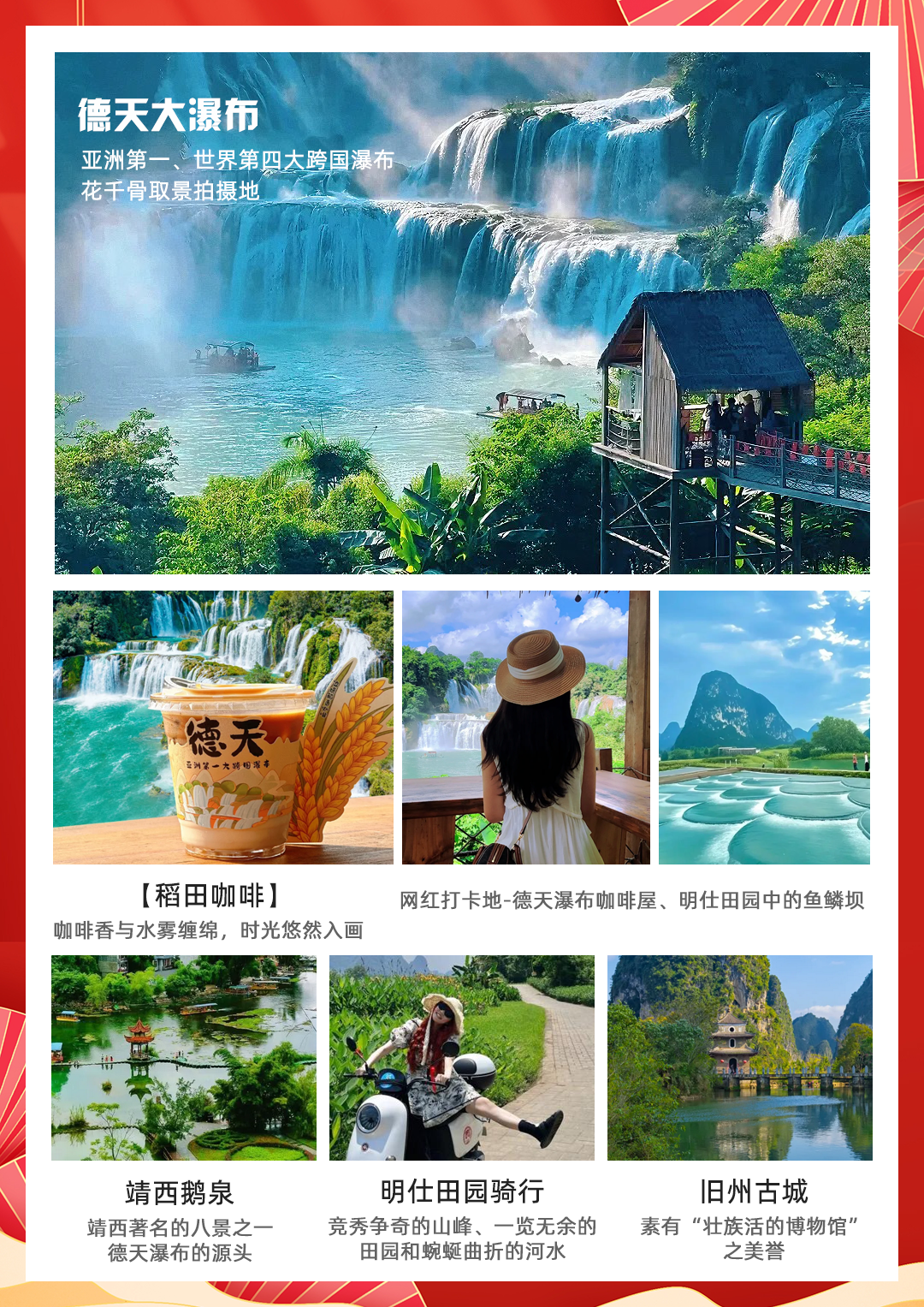 揽明仕山水入怀,赏德天飞瀑磅礴!打卡瀑布咖啡,精心安排每人一杯稻香咖啡品尝 把山水浪漫喝进胃里;夜游靖西古镇,奔赴一场篝火狂欢。枕着边关晚风入眠,这趟桂西之旅,简直爽到心坎里!