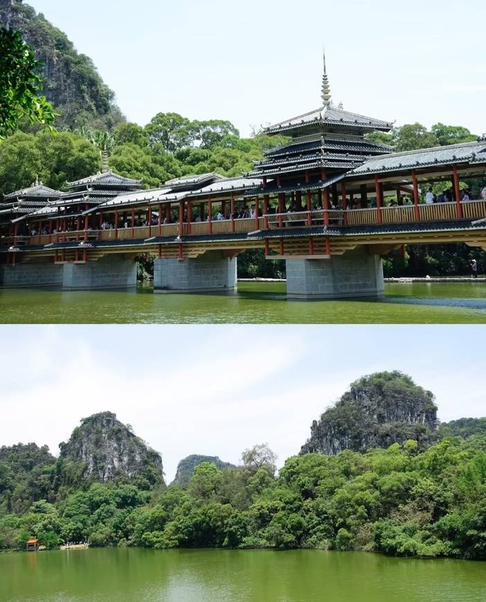 08:30-10:30前往【大龙潭风景区】(4A级景区,游览时间约1.5小时),中国“喀斯特绿宝石”流连忘返梦幻般的山水景观!大龙潭风景区别具匠心地以广西及我国南方少数民族多姿 多彩的民族建筑、风物民俗为主要建园内容,融少数民族风情特色与秀美的自 然景色为一体。民族风情游览 线已初具规模,以“鼓楼”、“龙潭风雨桥”、“木楼民居”和“轻松山房”等建筑组成的侗寨蔚为壮观。静卧镜湖上的"龙潭风 雨桥"系仿古钢筋混凝土廊桥式筑,以三江程阳风雨桥为基本 设计、建造而成。整座桥亭飞檐,极具特色。傍水而建的九层瓒尖式鼓楼为正四边形塔楼结构,飞檐重阁、琉璃瓦饰、葫芦顶、端庄肃穆;内设景廊,盘旋而上,上悬“款鼓”。既体现侗人击鼓示警聚众之意,又应合游人登高望远之心。