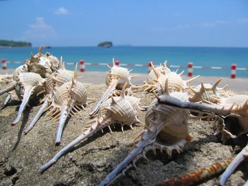 贝壳沙滩的沙子很漂亮很松软,在阳光的照射下很白,刺得人睁不开眼睛。天空与白云、海水与浪花、沙滩与茅草棚、渔船与远处的风景。夏天在这里很适合游泳和潜水。