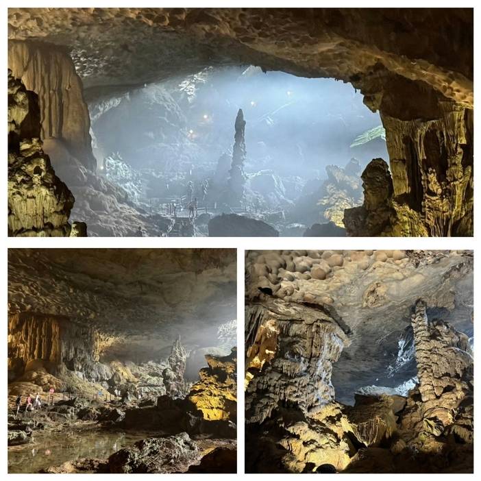 后参观位于下龙湾游区中心的无串子(BOHON)群岛上,特大喀斯特地貌天然溶洞【惊讶洞】惊讶洞是下龙湾上最宏大,美丽的溶洞之一。下龙湾的岩洞众多,而惊讶洞就是其中之一,外表看上去其貌不扬,走进去别有洞天。有倒挂的钟乳石、光影婆娑,还有各种形状奇特的石笋等。游客进入洞中,会感受到温度骤降,十分凉爽。加上灯光效果,整个洞穴充满了魔幻色彩。出洞前,还可能会看到耀眼的光束从裂缝投射进来。从洞口向外眺望,还能再次欣赏到美丽的下龙湾景色。