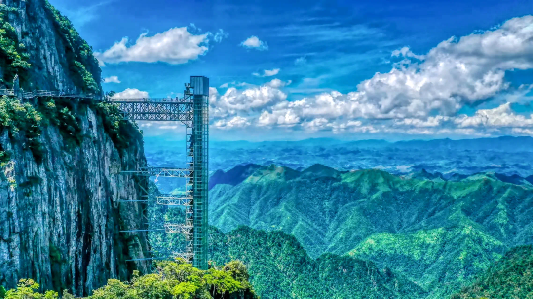 13:00 前往上层栈道,可以走路,也可自愿体验《流浪地球2》现实版太空垂直电梯(单程40元/人,往返80元/人,自愿自理不强制!),依傍悬崖而建,海拔高度1600米左右,连接上下两条无障碍游步道,游客从山底达到山顶,借助这部电梯仅需59秒,就可以“穿越”50层楼的高度。