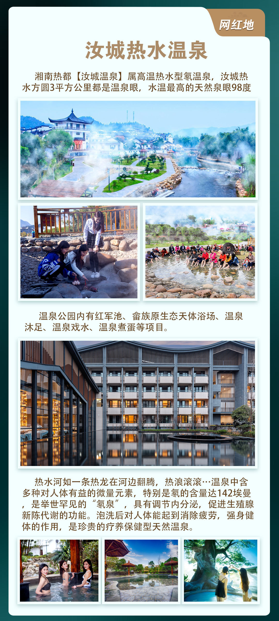 汝城热水温泉四季滚烫,如沸水开锅,又名“汤河”,温泉水温一般在91.5℃,最高的达98℃,天然流量总计36.3升/秒(300吨/日),是我湖南省水温最高,流量最大的天然热泉,经化验温泉水为弱碱性矿泉水,水质优良可以制作矿泉水,啤酒饮料,含有硅、钠、钙、锂等30多种化学元素,具有促进人体的新陈代谢,消除疲劳,据联合国教科文组织官员实地考察,福泉山庄热泉水“氡”含量达到了130IMA左右。
