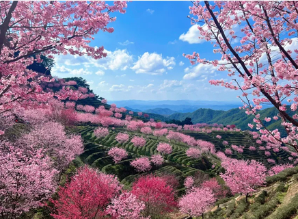 千亩茶园,万株樱花,迎春暂放,漫山遍野的粉色花朵,点缀在四季常青的茶园内,层层叠叠,烂漫无比,深深吸上一口充满花香与茶香的空气,沁人心脾...