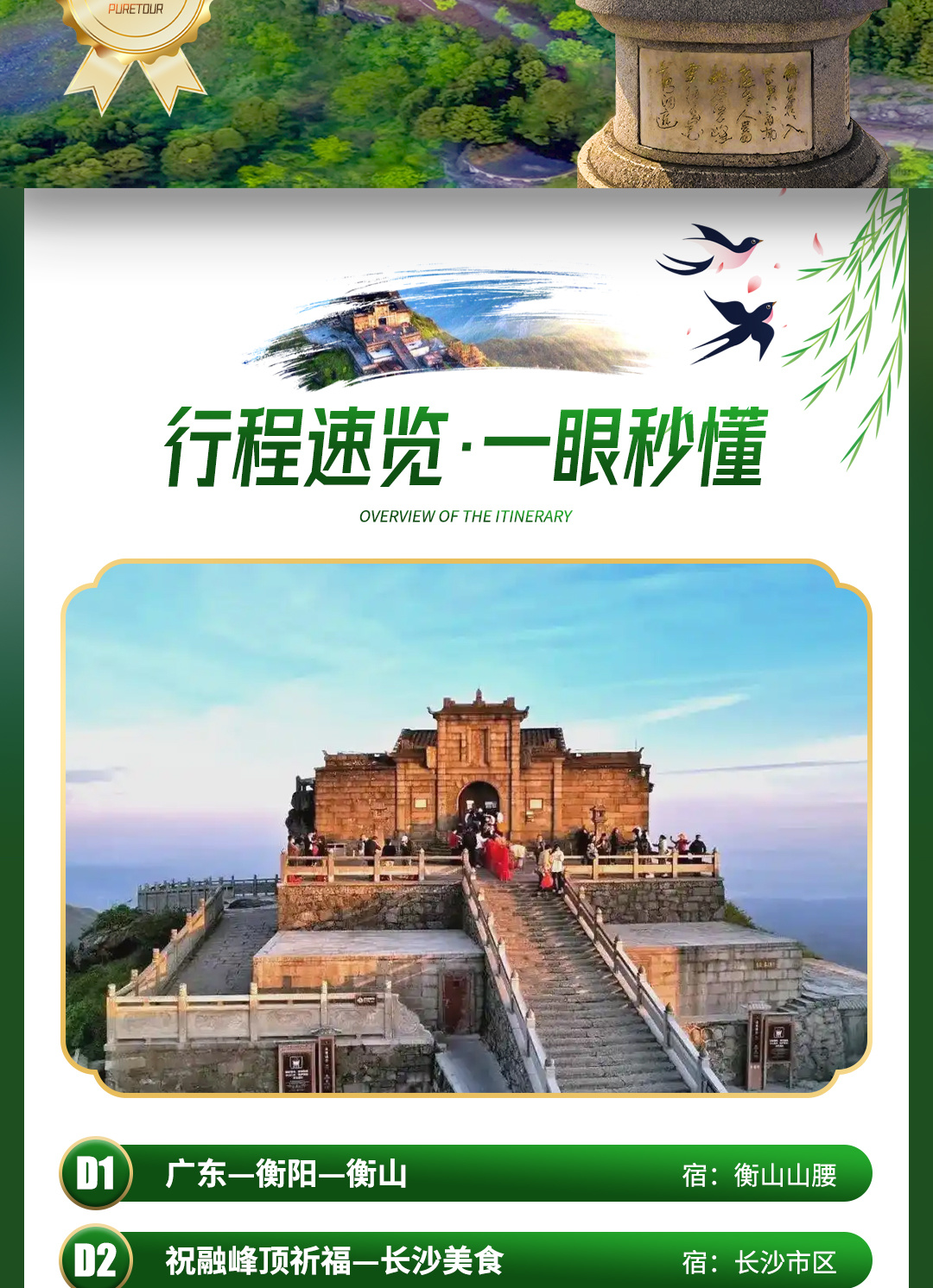 抵达最高峰——祝融峰海拔高度1290米,那有祝融殿、望月坛、南天门牌坊、“钢丝王子”阿迪力世界纪录创造地,会仙桥观音岩,看云海翻腾,日出胜景,南岳衡山风光美不胜收。