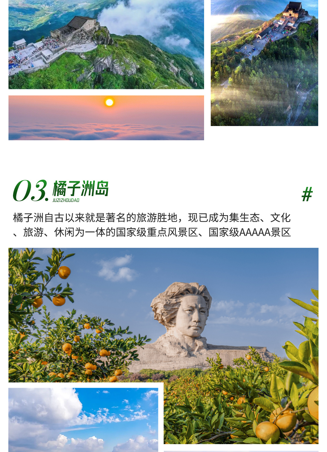 橘子洲形成于晋惠帝永兴二年(公元305年),距今已有1700多年的历史。1925年毛泽东从广州回到湖南领导农民运动,寒秋时节,重游橘子洲,凝望着滔滔北去的湘水,挥笔写就脍炙人口的《沁园春·长沙》,抒发了心忧天下、济世救民的壮志豪情,洲以人传,诗壮名城,由此橘子洲声名大振。