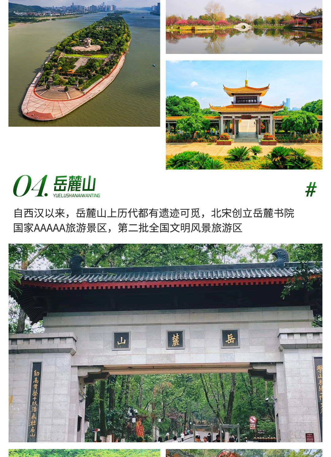 毛泽东求学常与学友来此游憩,“爱晚亭”扁额便出自他的亲笔手书。山上文物古迹众多,是寻幽访古的好去处。