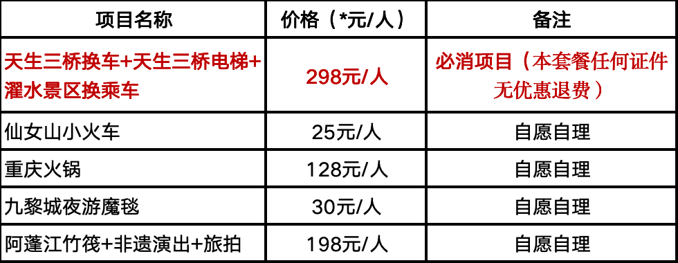 用餐:含 4早4正(其中升级1餐黔江特色长桌宴+升级1餐黔江鸡杂)(不用不退费)