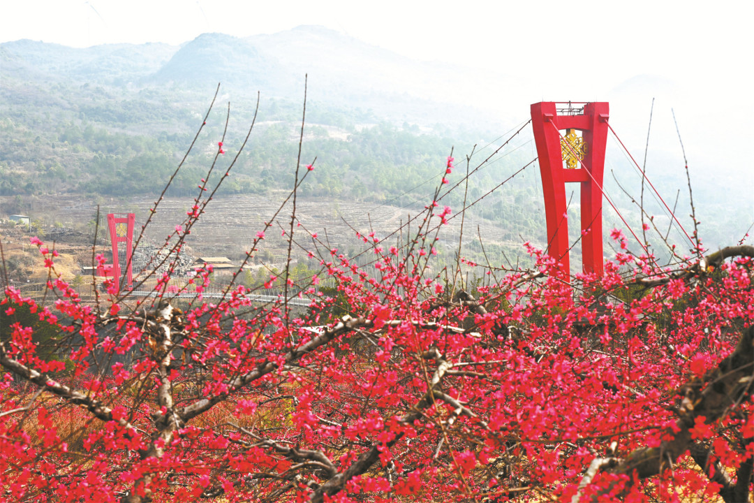 横亘在湟川三峡上的一条“红色巨龙”,氤氲着古色古香的秦汉气息,延续着盛世气派的唐宋遗风,沿袭着灿烂辉煌的魏晋脉络,流转着独领风骚的元明清神韵,两端桥塔上盘成错综复杂的中国结,高度概括着龙的传人生生不息的历史,同时也代表“吉祥如意”和“团圆兴旺”。