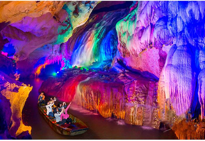 洞内有无数千姿百态、瑰丽多彩的钟乳石,游览范围共分三层:上中两层为陆地层,厅堂高大宽阔,岩壁坚固,雄伟壮观,“瀑布”“山林”、“幽谷”、“田园”、“瑶寨”,百花争艳,鸟飞云走……;下层是一条地下暗河,由北向南蜿蜒1500米,经过三个美丽的峡谷,穿过四座山头底部,河面宽1.6-10米,水深1-7米,两岸奇景密布,巧夺天工,美不胜收。