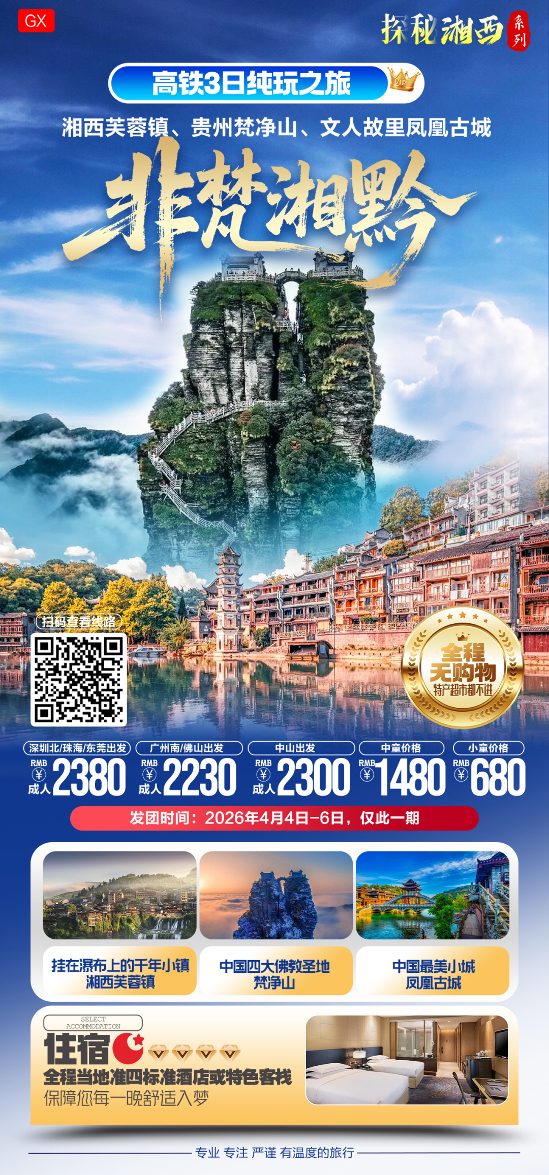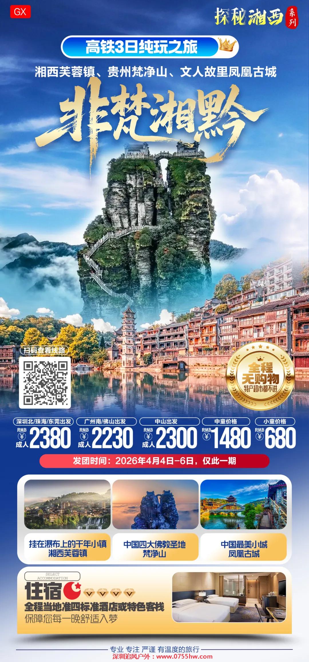 品质如一、放心出行!户外纯玩、广东成团! ★购物:全程无购物,特产超市都不进,没有任何隐性消费。 ★住宿:全程当地准四标准酒店或特色客栈,保障您每一晚舒适入梦 ★景点:最美小城--凤凰古城、挂在瀑布上的小镇--芙蓉古镇、梵天净土--梵净山
