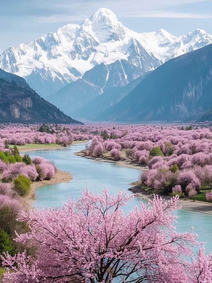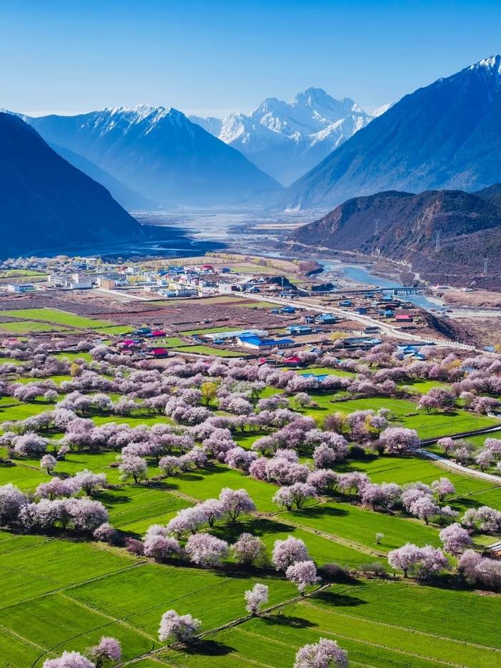 【藏式村落桃花源】林芝桃花源位于西藏林芝,当地桃花繁盛似锦,江水碧绿如玉,雪山挣脱云雾的缠绕,俊美而挺拔,被誉为雪域高原的小江南