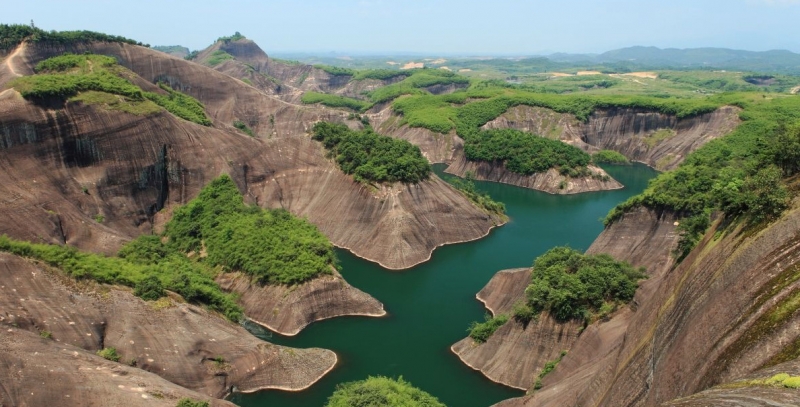 其最大的特点就是丹霞地貌周边有漂亮的水洼点缀,红岩绿水、险寨奇涧,美得一塌糊涂。
