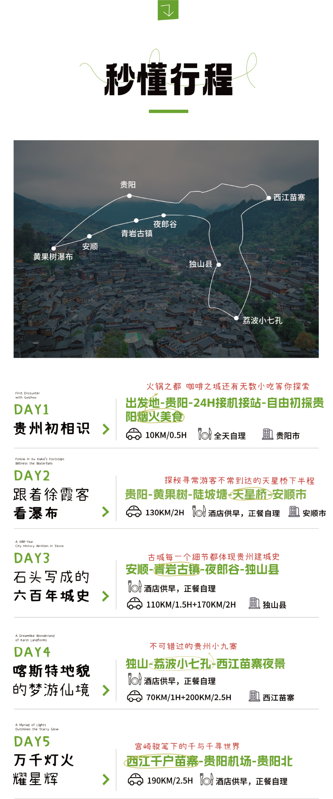 ② 我们大概于13:00于西江苗寨出发,大约15:30到达贵阳机场,16:00到达贵阳北站,请大家定17:00后起飞的飞机班次,贵阳北站16:30后的返程高铁;贵阳东站的朋友可在贵阳机场下车手打车到贵阳东站(贵阳东需定16:30后的班次),打车约20分钟。