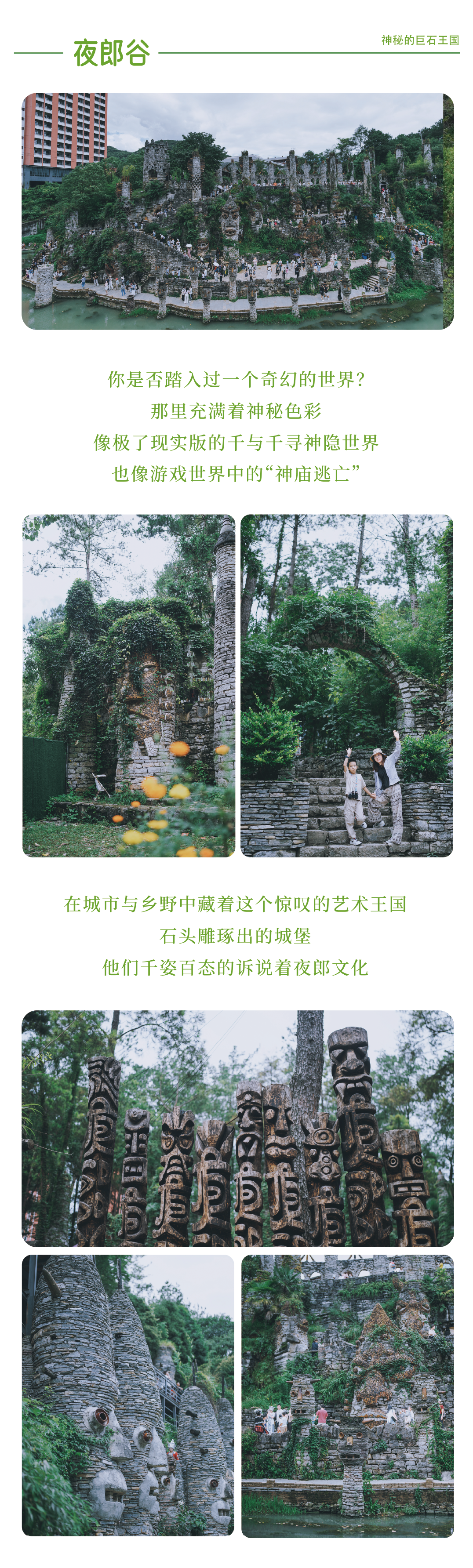 随后前往夜郎谷,夜郎谷是宋培伦教授按夜郎古国的记载打造的夜郎文化园,夜郎谷内造型奇特,是国内独一无二的夜郎文化展示中心。下午游览结束后乘车前往独山或荔波县城入住酒店。