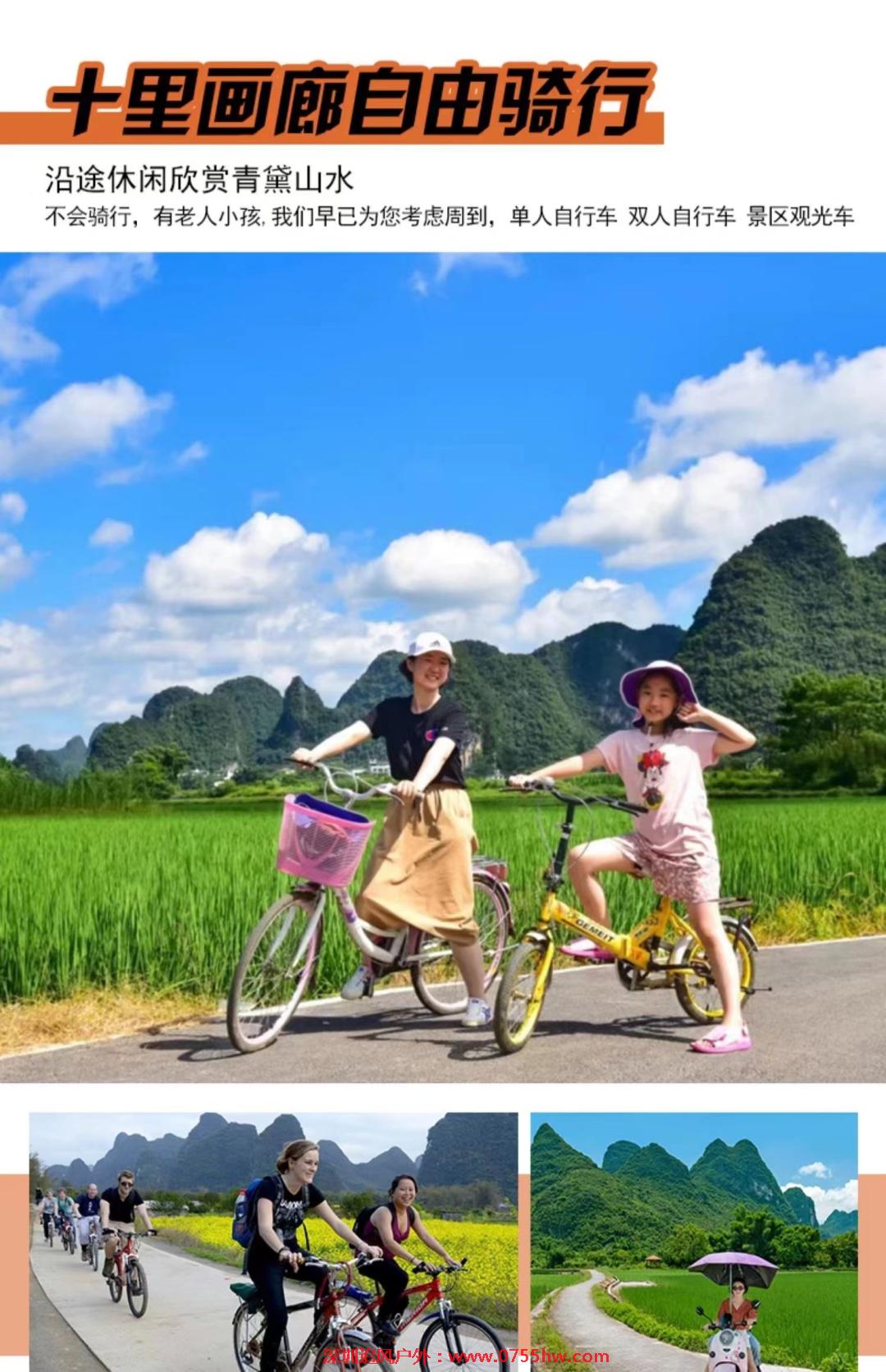 07:30 左右酒店集合统一到附近挑选适合自己的单车或者电动车,开始骑行十里画廊+旧县村+遇龙河大环线,全程大约10-20KM,租电动车【30元/车坐2人或1人】,途经遇龙河公园、夏棠码头、旧县码头、旧县村、十里画廊,尽览阳朔田园风光。不想去骑行和漂流的小伙伴可以自由活动就在十里画廊,遇龙河走走逛逛拍拍照。