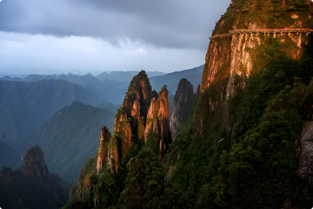 10:30 深度游览五指峰景区,漫步悬空栈道,南中国最长的悬空栈道;全程总长约8公里,海拔1400米至1600米,两层栈道,全程无障碍观光环线,登高山、临绝壁如履平地,尽享“非人”奇遇。