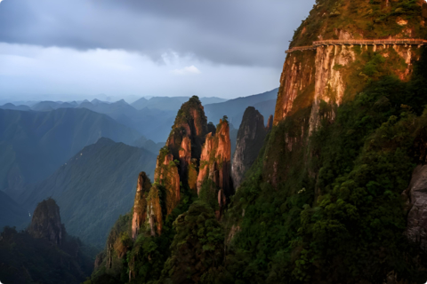13:00 前往走上层栈道,可以走路,也可以体验垂直观光电梯(电梯不含在大门票里面,自由选择,自理费用:单程40元/人),五指峰核心景区,悬崖栈道,莽山新十景,一一亮相在你眼前,景区内的崖子石(又名天台山),山势雄伟,气势磅礴,崖险谷幽,奇峰怪石遍布。雨后放晴时节,这时云雾缭绕,恍若人间仙境。这里富含着悠久的文化,不腐女尸之谜更令人神秘莫测。该景区主要有仙掌峰、童子峰、金鞭神柱、伟人会观音、东天门、天南第一险、小华山、仙韭菜坡、杜鹃林、观音堂、天台寺、千年红豆杉