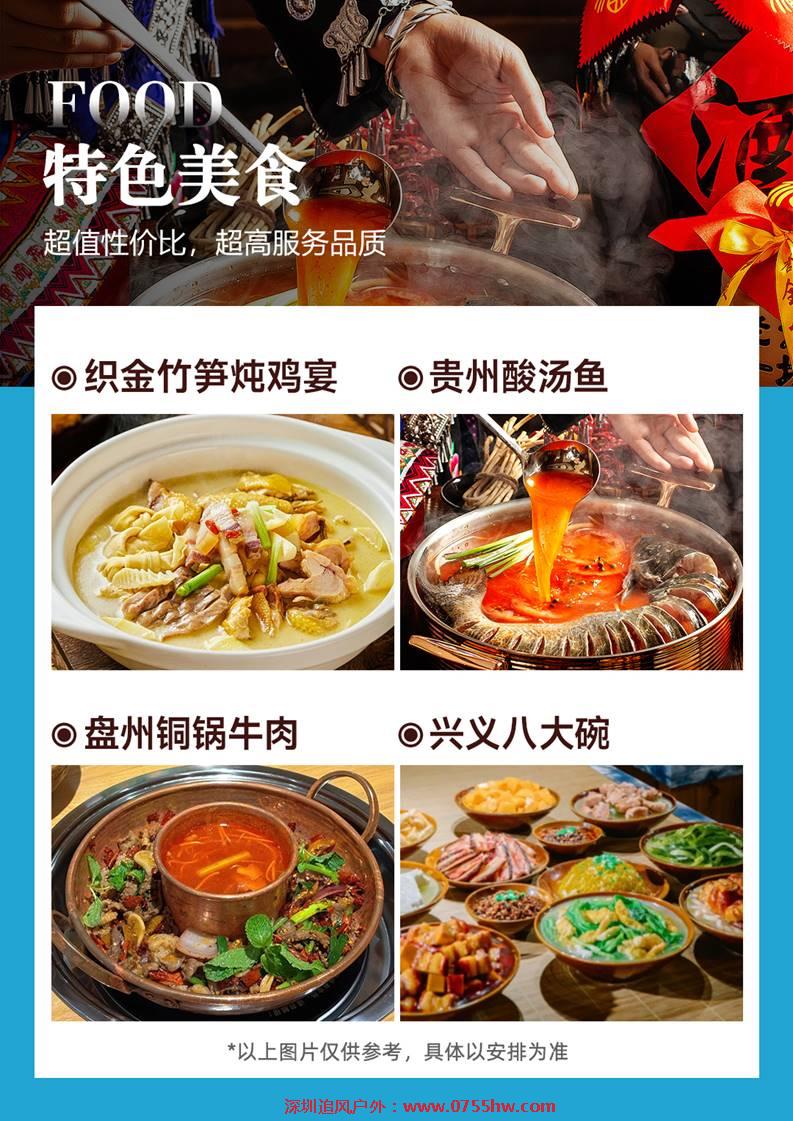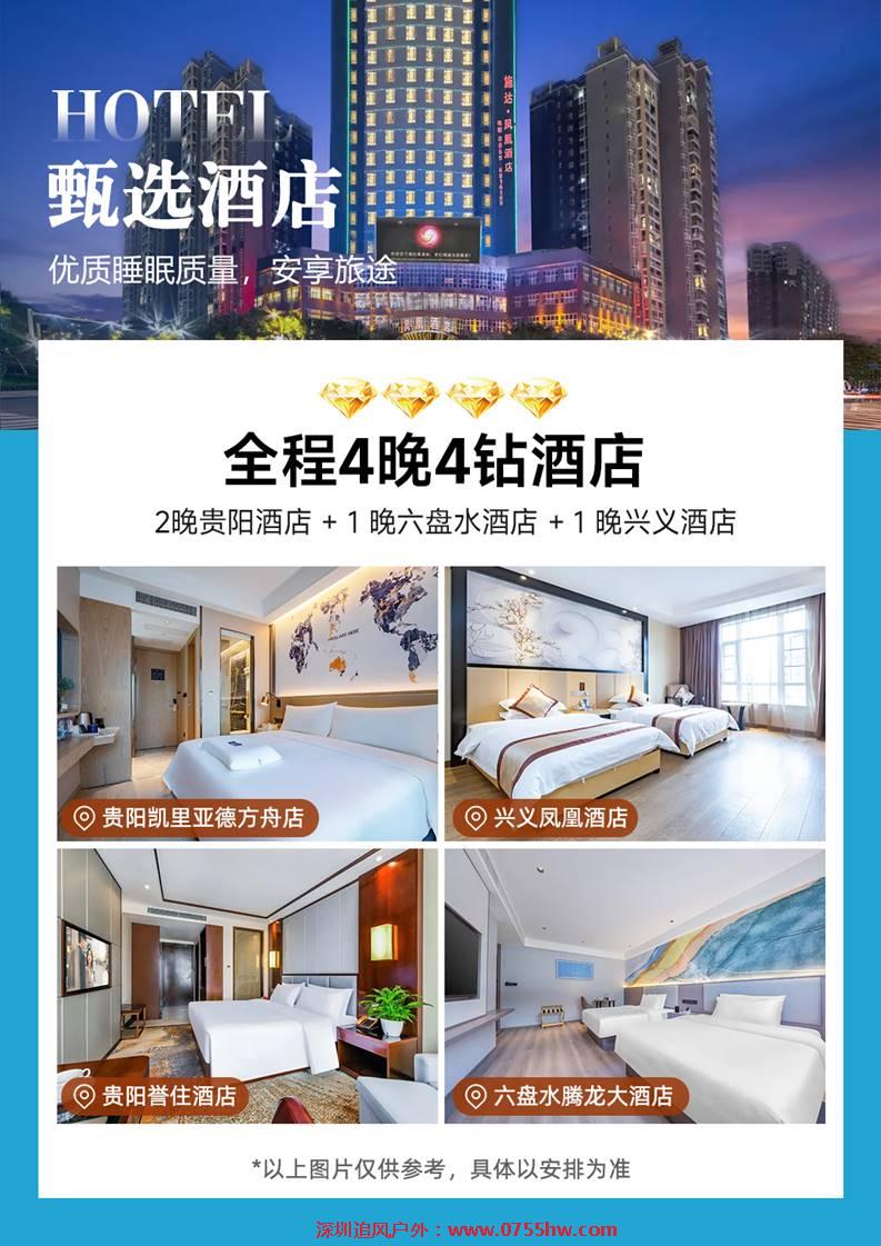 费用包含 | 交通:深圳/广州-贵阳往返高铁/动车二等座;当地空调旅游大巴车10,保证每人一正坐;满10人升级2+1陆地头等舱豪华旅游巴士,全程一车一导游; 酒店:全程4晚4钻酒店备选酒店: 备选酒店: 贵阳:贵阳凯里亚德方舟店/誉住/锦江都城/云鹭或同级 兴义:凤凰/洛克或同级 六盘水:腾龙/艾兰/维也纳或同级 本行程优先安排入住所列备选酒店,备选酒店可能会因自身接待能力或政府、会议等因素造成旅行社团队不能入住或不能连续入住,如有特殊情况不能安排所列备选酒店,我社有权协调安排其他同等级酒店,不作另外退费和补偿,请理解与支持,谢谢 用餐:4早5正餐,餐标40元/人/餐。10人一桌,人数不足10人菜相应调整(行程中备注不含用餐敬请自理,如因自身原因放弃用餐,则餐费不退) 门票:含行程所列景点首道大门票,具体请参考行程描述。(贵州景点购票为实名制,请提前准备身份证交予导游) 导游:持证中文导游服务,(接送站不是导游,为公司特意安排的接送站人员)。 保险:包含旅行社责任险,代购24万个人旅游意外保险。 |