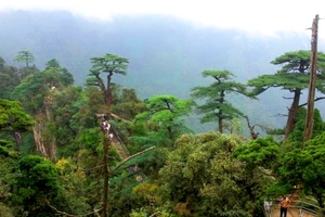 莽山国家森林公园: 莽山位于湖南宜章县,与广东接壤,距郴州市区130公里,总面积2万公顷,是南北植物荟萃之地,目前世界上亚热带原始次森林、常绿阔叶林保存最完好、最具代表性的林区。有植物1700余种,其中属国家一级保护的珍稀植物5种;有脊椎动物近300种,其中雪豹、黄腹角雉、梅花鹿、金猫、蟒蛇等属国家一级保护动物。被中外专家称为“天然动植物博物馆”和“生物基因库”,是国务院批准的国家级自然保护区。这里气候适宜、四季如春,山清水秀,景色迷人,是旅游观光,休闲度假和避暑猎奇的好去处。 莽山,地球同纬度保存得最完好的原始森林,镶嵌在南岭山脉的璀璨明珠。她位于湖南省郴州最南端,是我国南方面积最大,生物物种保存最完好的国家森林公园。莽山山奇、水秀、林幽、石怪,境内奇峰叠翠、溪涧纵横,“莽山壮美惊天下、原始生态第一山”便是它最真实和生动的写照!莽山是人与自然和谐的精典之作,森林覆盖率高达99%!它因拥有一片世界湿润亚热带地区面积最大,保存最好的原生型常绿阔叶林和丰富的动植物资源而享有“地球同纬度带上的绿色明珠”和“动植物基因库”的美称。