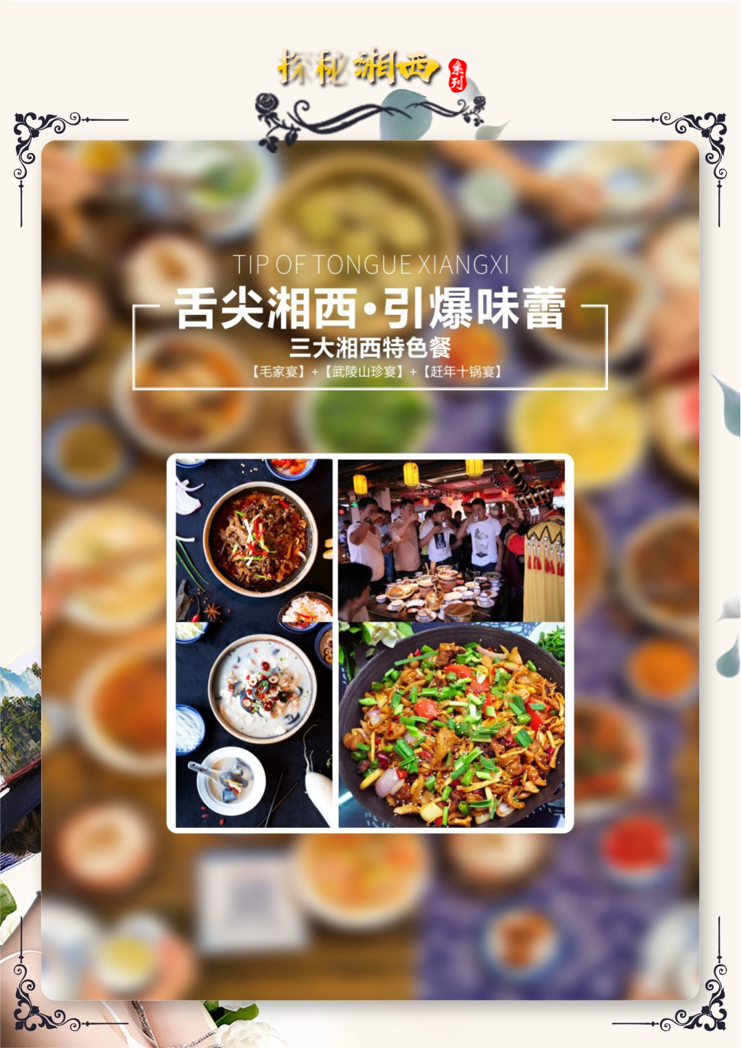 晚餐后特别推荐:大型民俗风情表演——【魅力湘西】(158元/人,自愿参加):神秘大湘西的文化盛宴,湘西五大少数民族的狂欢节。代表中国艺术全世界巡回演出,让世界重新认识中国,魅力中国,见证了民族的,才是世界的!