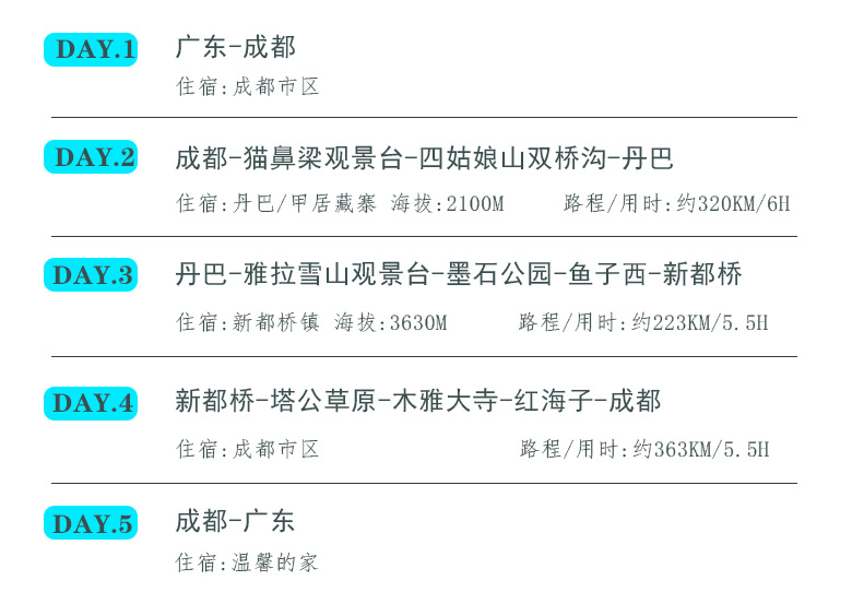 17:00左右出景区后途径雅安、天全,回到成都,自由晚餐