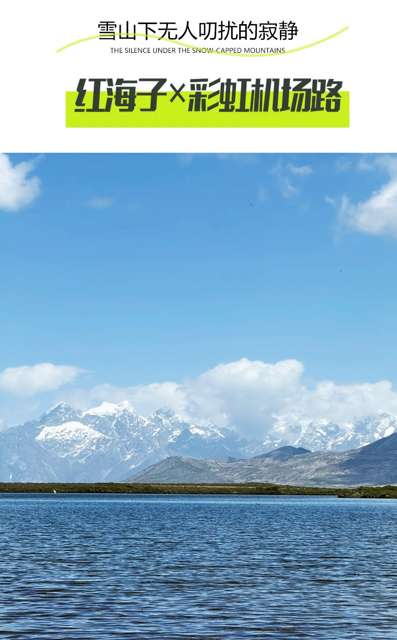 途径【434机场路】感受魅力川西的公路与雪山融入一幅画卷的魅力,后再前往红海子,【红海子】(清洁费约30元,当地人收取)。被称为藏在山海间的天空之镜,位于康定434机场路边,湖水清澈碧蓝,春夏时节湖畔草色青青,山花烂漫。秋冬时节湖畔茫茫雪似白纱笼罩,湖面上,轻烟薄雾,如梦如幻。