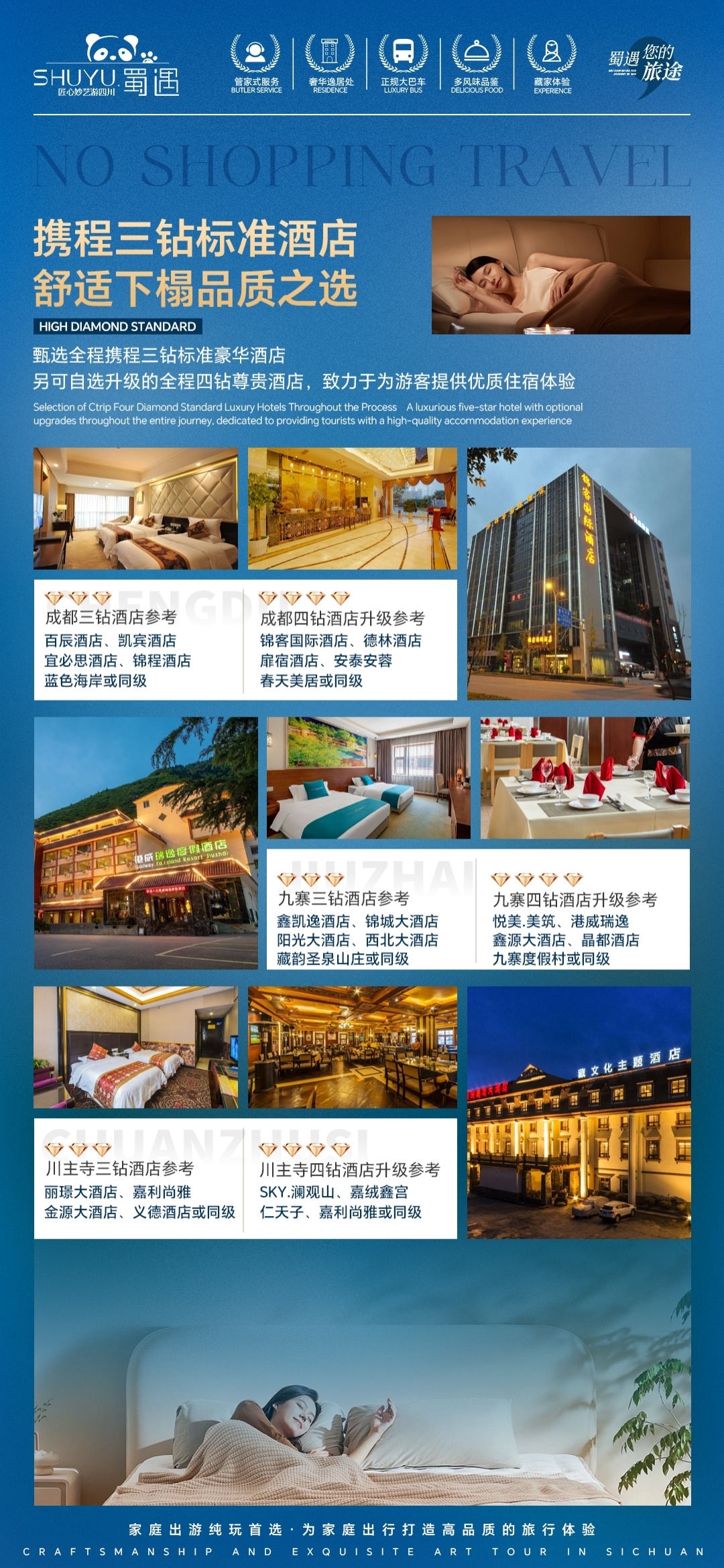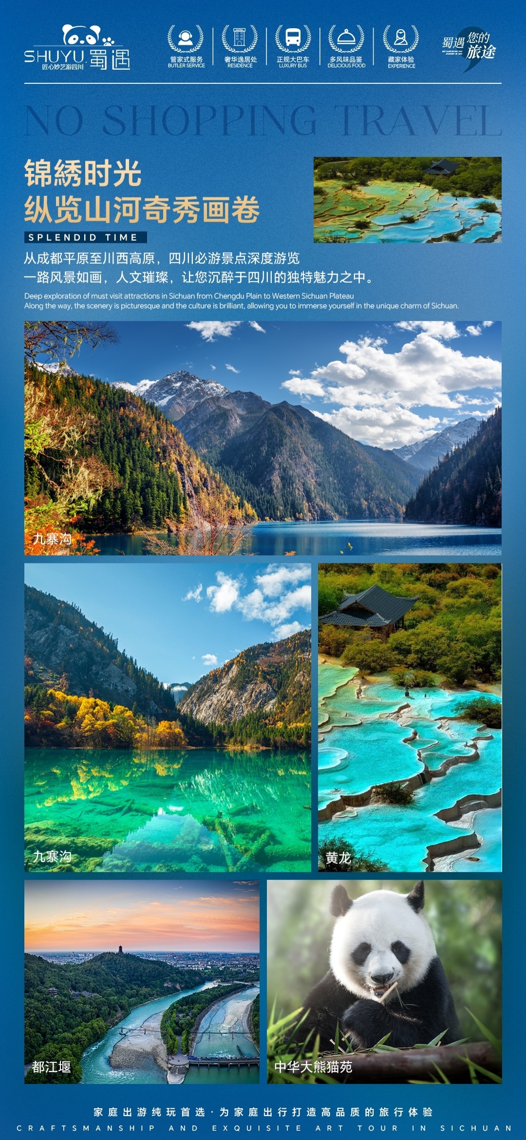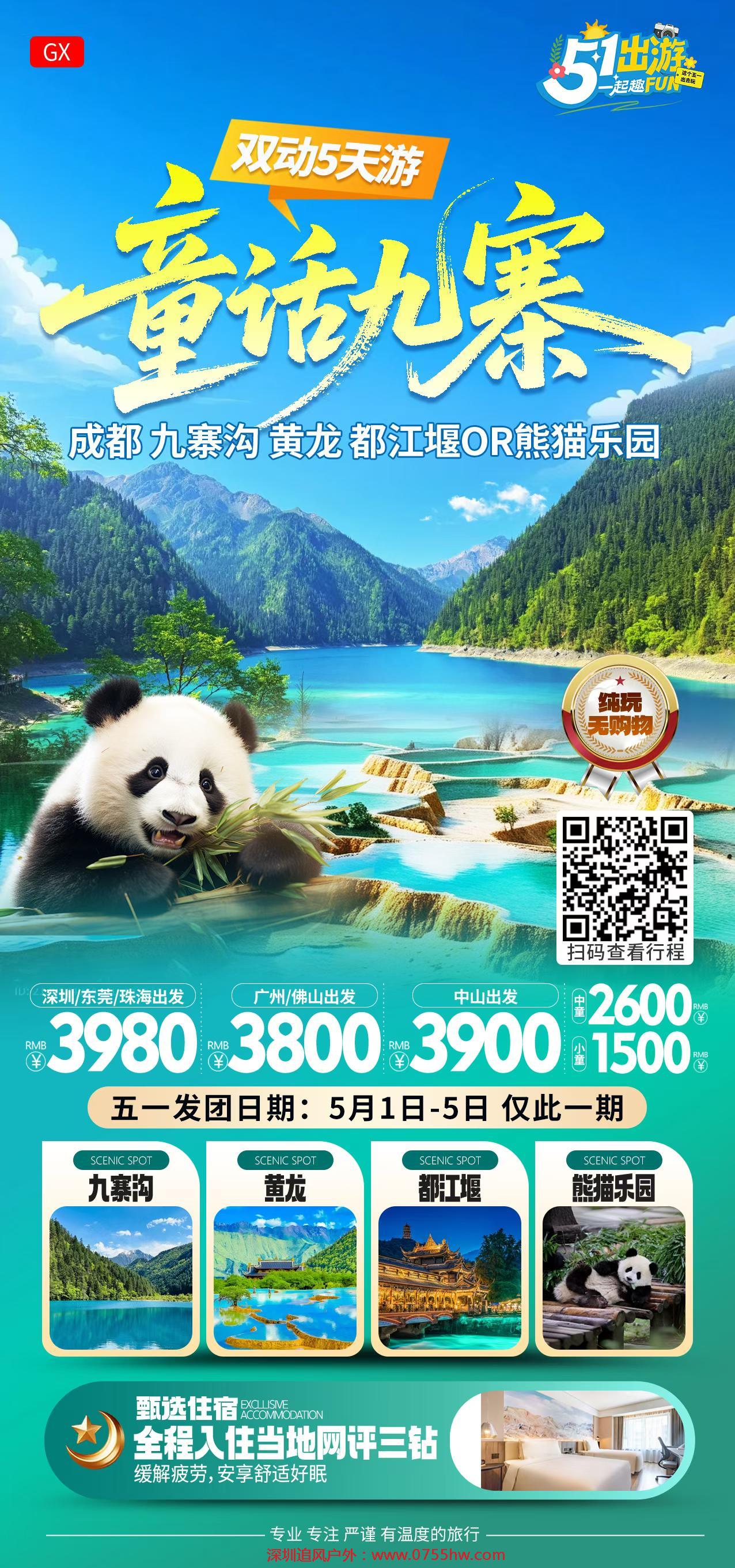 [游览] — 九寨沟风景区、黄龙风景区、都江堰风景区or中华大熊猫苑 [尊贵] — 全程入住舒适型酒店,网评指定3钻(可自费升级为携程4钻) [纯粹] — 无年龄地域限制,全程不进购物店 [独家] — 有趣的玩法百里挑一,不走常规的纯玩九寨之行 |