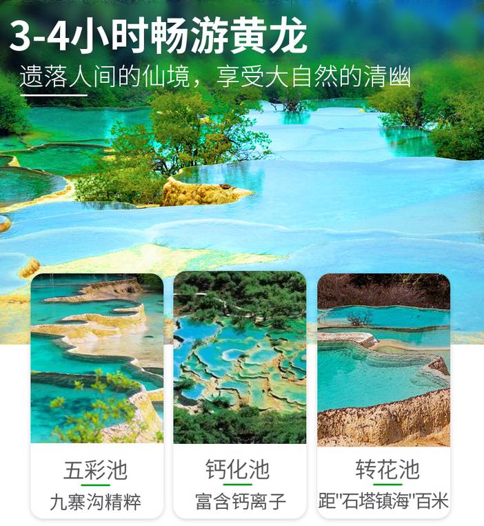 【黄龙风景名胜区】(5A景区门票已含 自理黄龙上行索道80元/人,下行索道40元/人、电瓶车20元/人、黄龙定位讲解器30元/人,黄龙索道保险 5/人/段需自理)