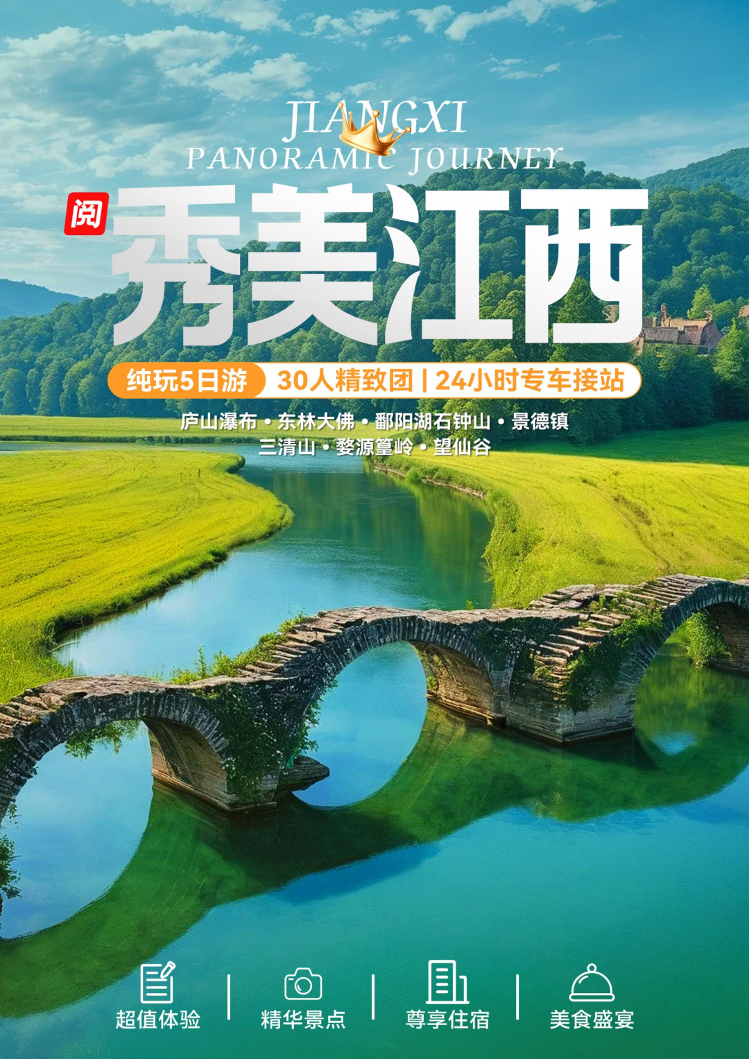 【庐山瀑布·东林大佛·鄱阳湖石钟山·景德镇·三清山婺源篁岭·望仙谷5日游】