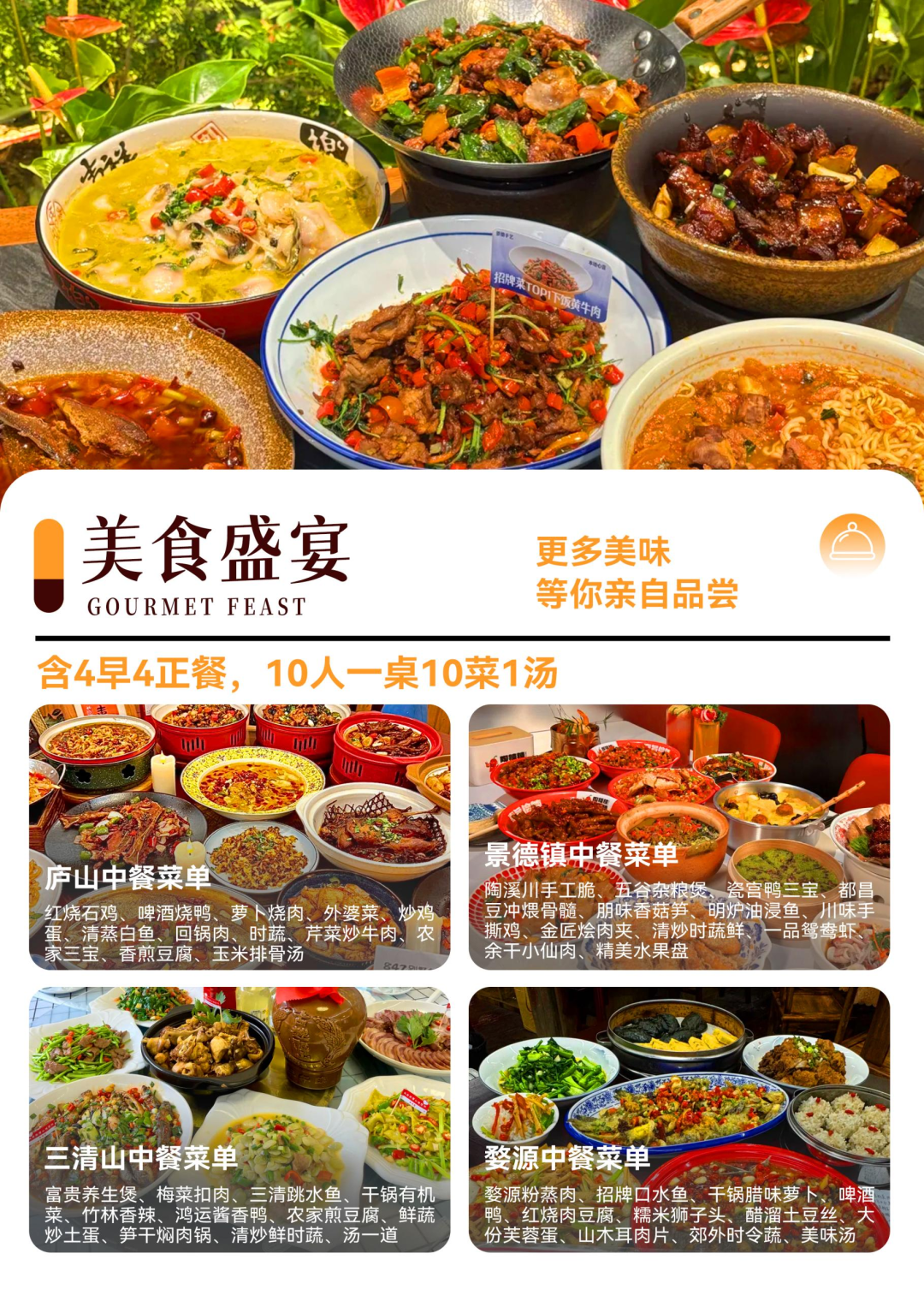 第四天婺源中餐菜单:1、婺源粉蒸肉2、招牌口水鱼3、干锅腊味萝卜4、啤酒鸭5、红烧肉豆腐泡6、糯米狮子头7、醋溜土豆丝8、大份芙蓉蛋9、山木耳肉片10、郊外时令蔬11、美味汤一道