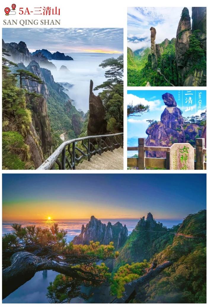 车赴国家AAAAA级风景名胜区、世界自然遗产地——【三清山景区】(缆车往返125元/人自理)位于江西省上饶市东北部,是集自然奇观与人文底蕴于一身的世界自然遗产地、国家5A级旅游景区。它因玉京、玉虚、玉华三峰峻拔入云,宛如道教玉清、上清、太清三位尊神列坐山巅而得名,主峰玉京峰海拔1819.9米,雄踞怀玉山脉群峰之上。乘金沙索道上山,游览【南清园景区】,可观赏小象戏松、神驼峰、孔雀迎宾等,穿过栈道沿途可欣赏三清山三大绝景之一的【巨蟒出山】、神猫待鼠、财神爷、企鹅献桃、万笏朝天,至【女神峰】观景台游览拍照,中餐后走台阶前往杜鹃谷观景台赏千亩杜鹃、云海。再往玉台方向,途经千年神龟、雏鸡出壳、大峡谷、仙翁唱歌,在海拔1580米的玉台观景台,可观赏【玉京峰人民大会堂背景国画“江山如此多娇”】,后下台阶往【一线天】,赏姜太公钓鱼、生死恋、铡刀石、神龙戏松等,最后走【东南栈道】(三清山最长、最宽、视野最开阔的栈道,全长5.6公里,约1.2小时路程)回到金沙索道上站,乘索道下山,全程不走回头路!金沙索道下站集合。