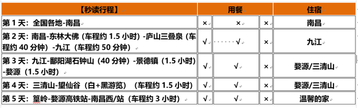 11、江西餐饮:餐饮方面:全程用餐的情况会根据游客游览的时间做一个合理的调整,视具体情况而定的;旅游目的地饮食习惯与出发地不同,江西口味重、偏辣且油腻,主食以米饭为主。不一定都能符合游客的口味;餐厅的服务水准也有一定差距,有需要时请与导游及服务员联系;我们将尽快为你解决问题。