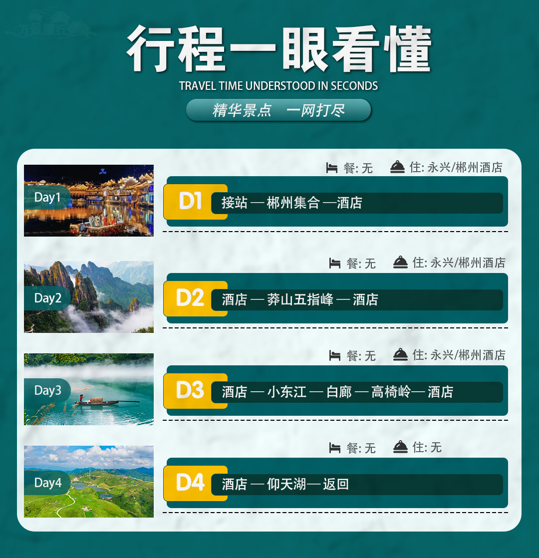 住宿:入住3晚网评精品酒店(郴州市或县城),参考(山水/高职院/莫林/府上等)
