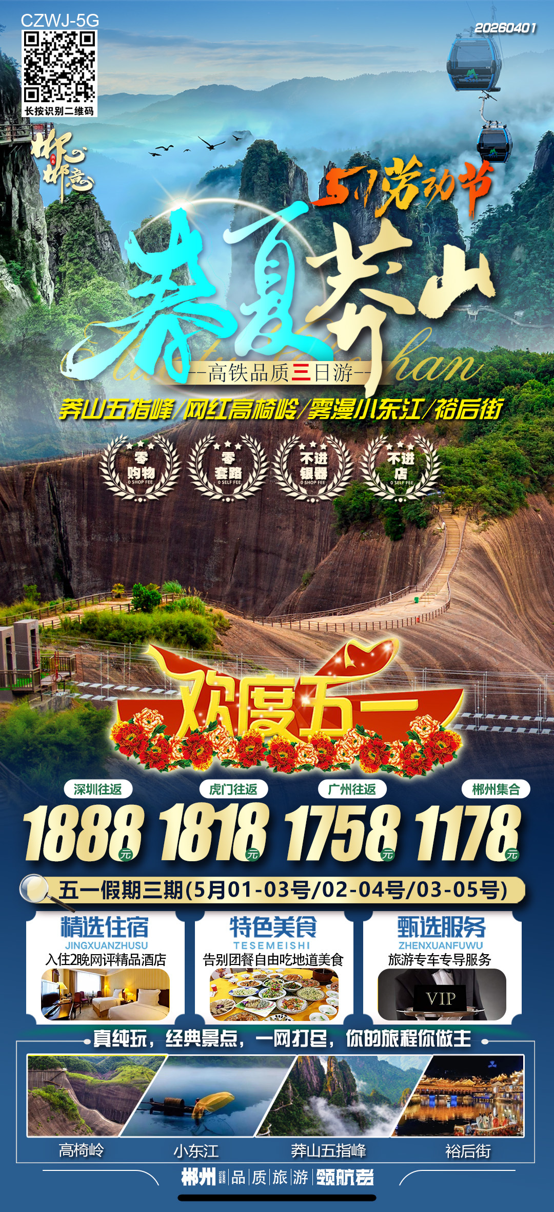 10:00自由到达景区东门口,坐景区接驳车,然后换乘缆车上山(没有其他交通工具,缆车费用自理);南中国最长悬空栈道:乘坐中国目前最长索道单线的观光缆车【五指峰索道】索道全长3.7公里,全国单线最长;每小时客运量达2000人,全国功率最大;全球索道极限高差,达1000米,创造了全国乃至全球索道领域的多项第一,堪称“世界一流、中国第一”五指峰索道。