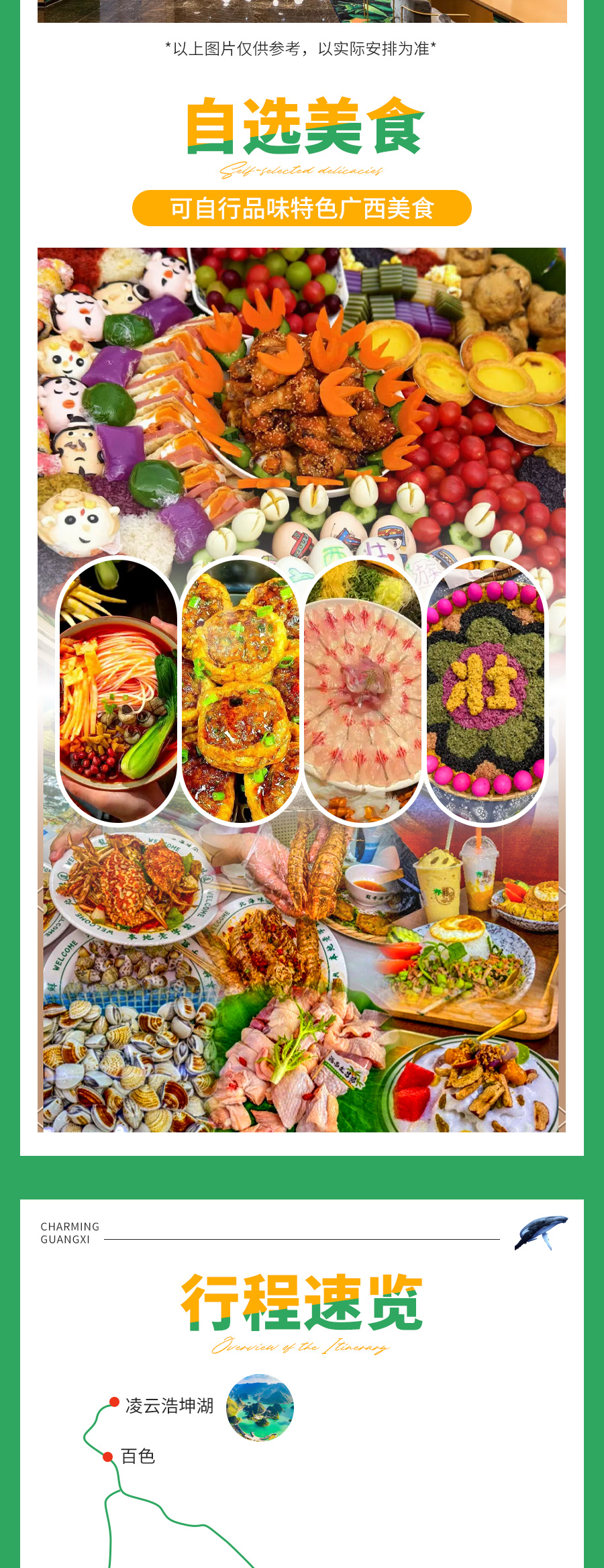 您可以在青秀山消磨大半天,莫奈花园、水生花园、萌生植物园等小景点,每一个都超级出片;或者跟着房琪打卡南宁的“宫崎骏漫画世界”——超治愈的滨江公路;去三街两巷自由闲逛,在古色古香中感受历史与人间烟火的交融;平西夜市的特色小吃,正等着您去大快朵颐。也可以自行前往万达广场、中山路、广西壮族自治区博物馆、民族苑等地方游玩。