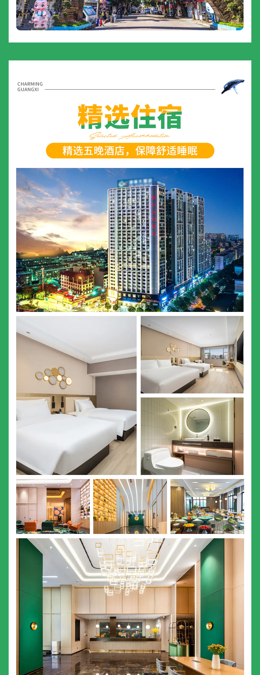 您可以在青秀山消磨大半天,莫奈花园、水生花园、萌生植物园等小景点,每一个都超级出片;或者跟着房琪打卡南宁的“宫崎骏漫画世界”——超治愈的滨江公路;去三街两巷自由闲逛,在古色古香中感受历史与人间烟火的交融;平西夜市的特色小吃,正等着您去大快朵颐。也可以自行前往万达广场、中山路、广西壮族自治区博物馆、民族苑等地方游玩。