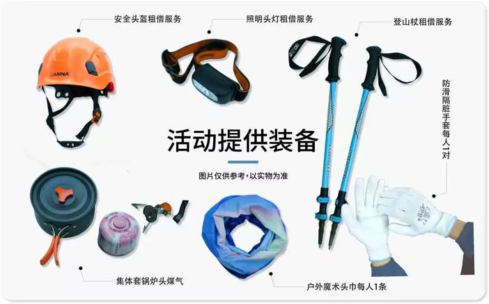 3.免费提供装备使用:头盔、登山杖各一件免费租借(用后回收,如需要双杖请提前告知);