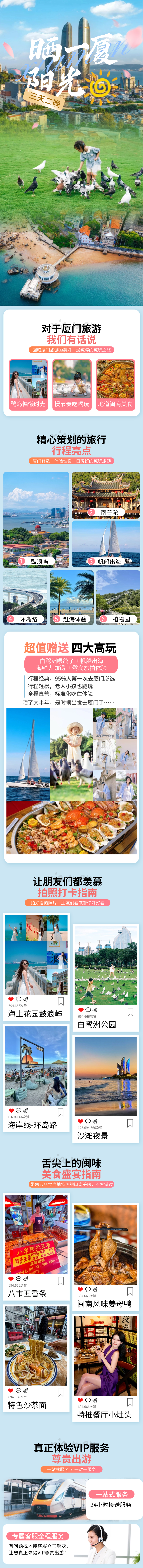 帆船出海、白鹭洲、鼓浪屿、网红打卡琴岛旅拍/市区航拍、环岛路、赶海体验、植物园、白鹭洲喂鸽子。