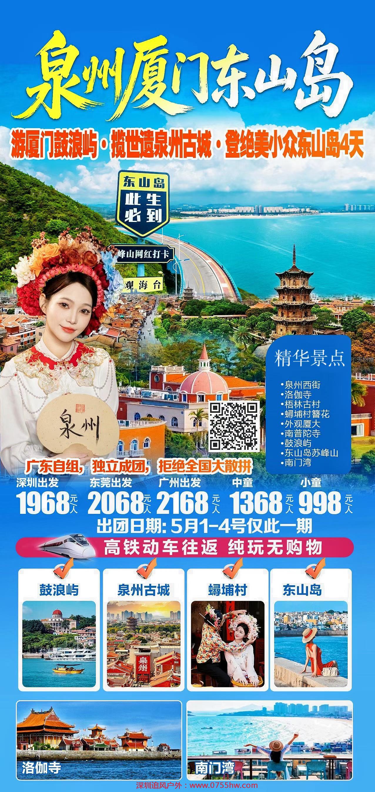 高铁动车往返:泉州西街+洛伽寺+梧林古村+蟳埔村簪花+外观厦大+南普陀寺+鼓浪屿+东山岛四天
