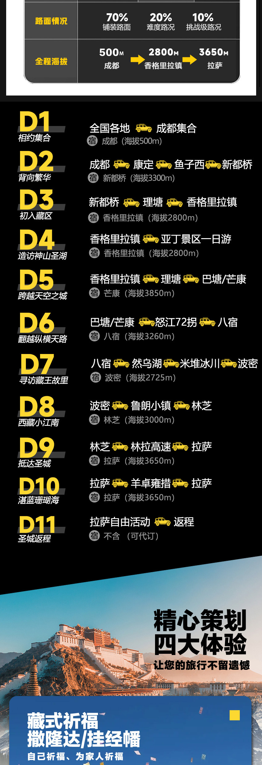 【海拔】卡子拉山海拔约4700米、理塘海拔约4000米、香格里拉镇海拔约2800米